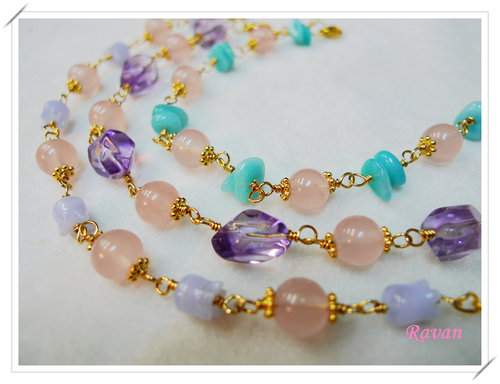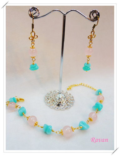 第一條實驗的當然就是烏鴉家大獲好評的藍綠色天河石,清爽乾淨的藍綠,搭配超粉的粉晶,