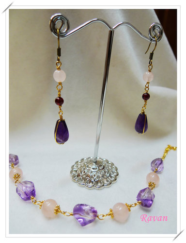 粉晶搭配紫水晶一直是傳統的配色,烏鴉選用淺亮的淡紫色不規則水晶,搭配圓潤的粉晶,