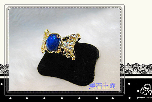 這個戒指的主人,和烏鴉一樣非常喜歡湛藍又帶有金點的青金石,和她認識也是一種莫名的緣份,不到一年的時間,我們一起創造了不少獨特的訂做品,這一枚戒指就是其中之一,考量她活潑樂觀的個性,我們採用了淡金色來凸顯這顆美麗的寶石,數顆鋯石點綴在兩側更是和一般常見的設計大異其趣,雖然是用師傅現成的台再做修改,但是手工拉花的線條卻一點也不馬虎,不低調但是戴在手指白皙的C小姐手上真是恰如其分的好看!!