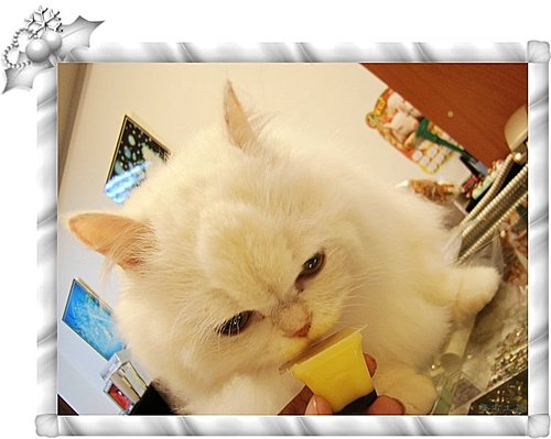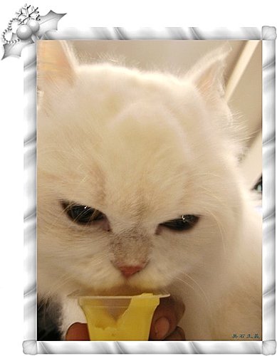 尤其是布丁,只要把布丁上面的膠膜撕開,不論當時噹噹躲在什麼地方,不管他是在睡覺還是在玩,一定會跑到妳面前,秀氣的喵喵叫(平時他是都不會喵的),那天帶噹噹去看醫生,順便帶來店裡,噹噹馬上表演吃布丁的絕技!