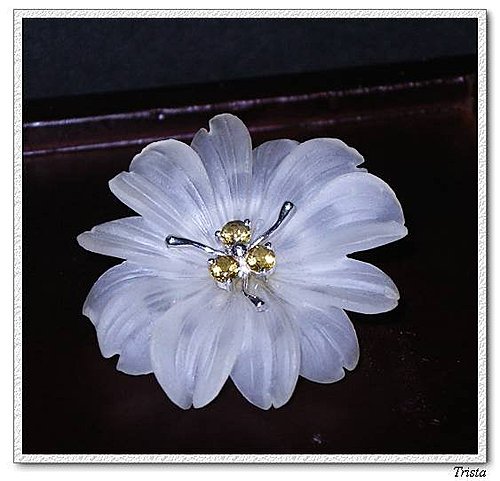 市面上白水晶的雕刻常見,但是傳統的雕件(人像、神像、吉祥物...)居多, 相對的這一朵小白花胸針就顯得特別清新脫俗,久看不膩。奇怪的是一樣用白水晶雕刻花朵,霧面處理總是比拋光處理的有質感許多,炎炎夏日聆聽著優美的旋律,一起來欣賞這朵清新小白花吧!